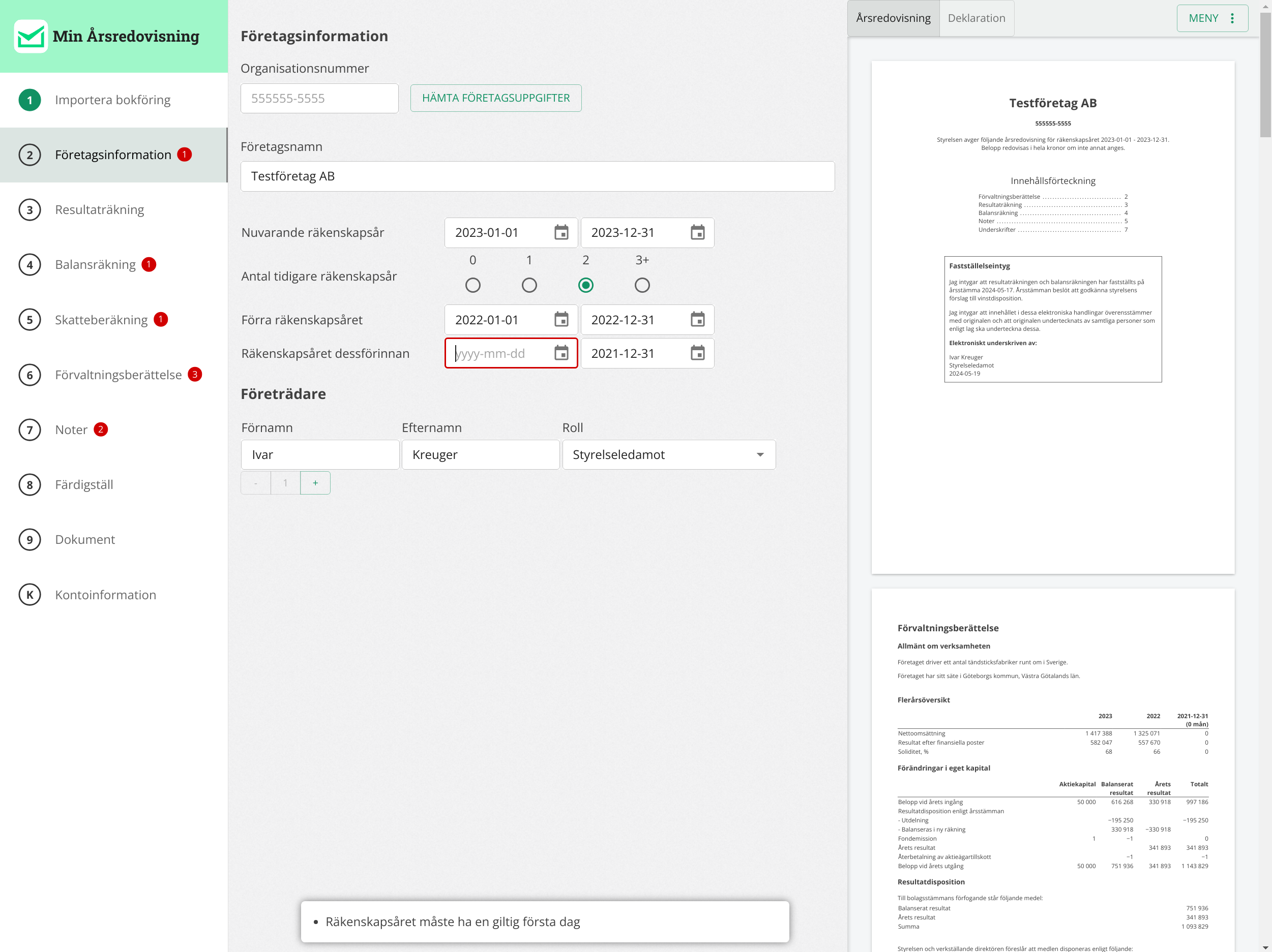 Här kontrollerar du företagsnamn, antal räkenskapsår och företagets företrädare. Endast företrädare som ska signera årsredovisningen behöver vara med i listan. Styrelsesuppleanter signerar normalt inte årsredovisningen men kan läggas till i listan om de ersätter en ordinarie styrelseledamot.
