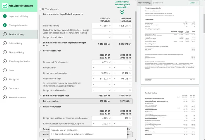 Väl inne i applikationen så behöver du gå igenom din årsredovisning i nio enkla steg (se flikarna längst till vänster i appen). Du kompletterar och godkänner varje del av årsredovisningen. Våra automatiska kontroller hjälper dig upptäcka vanliga fel. Betalning sker först i steg 8 när du har godkänt de första sju flikarna. Problem som måste åtgärdas innan du kan godkänna fliken visas i en ruta längst ner.